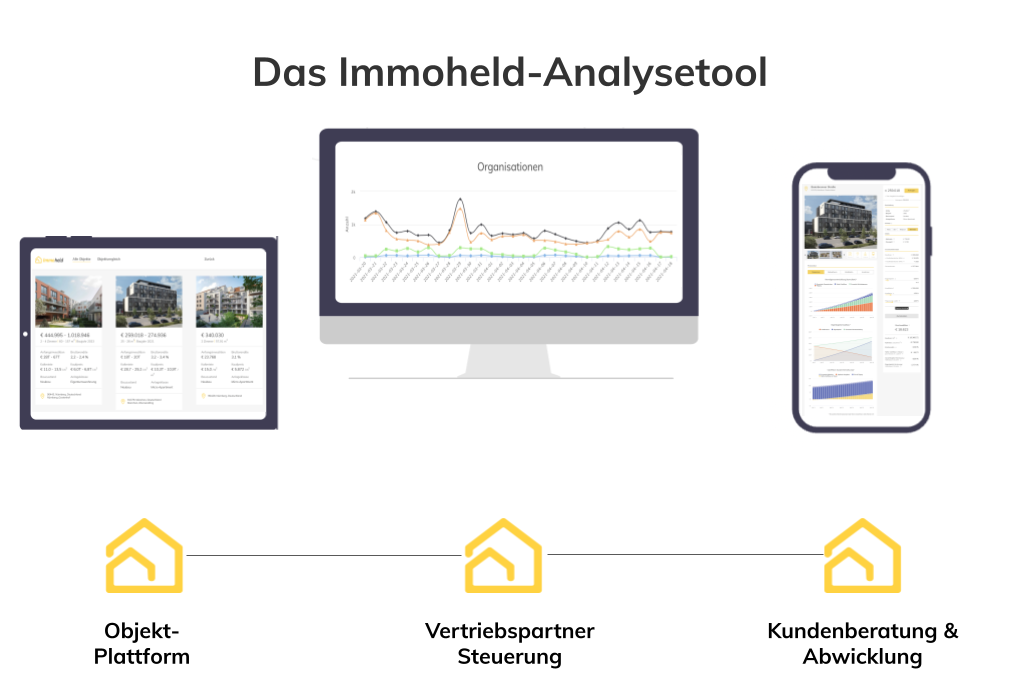 Als unser Partner erhalten Sie Zugang zur modernen Immoheld-Software: Das Analysetool bereitet die wichtigsten Daten zu Objekten einheitlich, digital und strukturiert auf. Anhand individueller KPIs können Sie alle Optionen schneller vergleichen und eine strukturierte, faktenbasierte und valide Entscheidung treffen.
